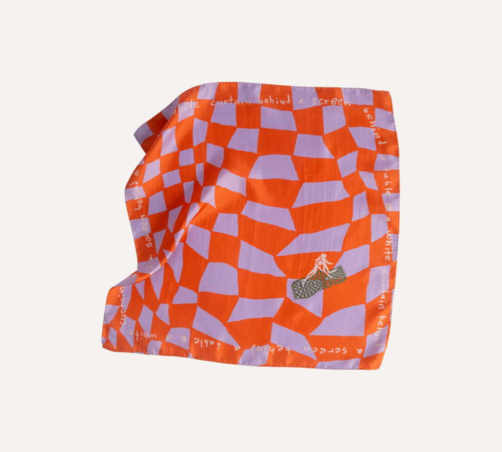 Lilac and orange form a playful pattern that seats two figures at a table. Who are they, and what might they be doing? This bandana holds a secret around your neck—can you uncover it?