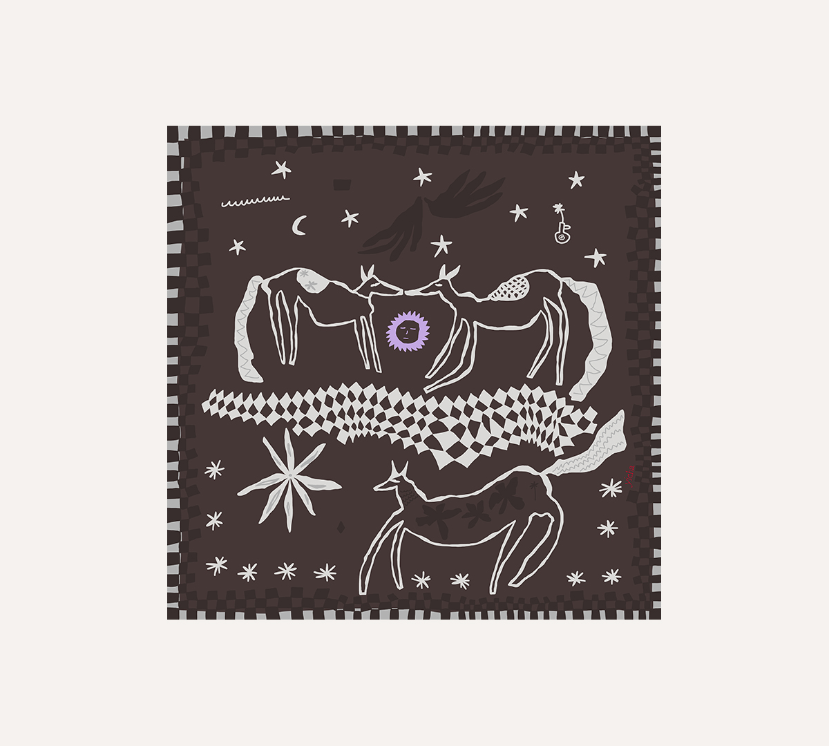 70 x 70 cm brown scarf Hand-illustrated by Georgina Pantazopoulou and transferred digitally in small amounts ethically in Greece. 100% twill silk made in Soufli, Greece.