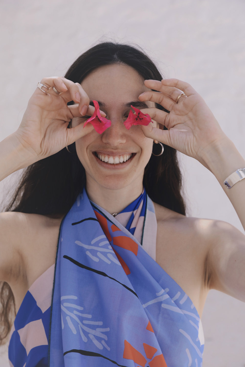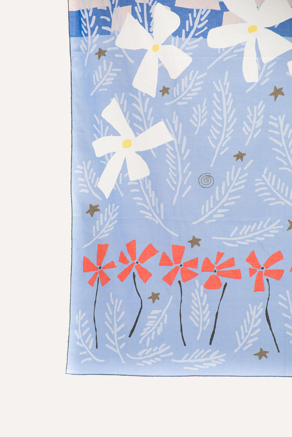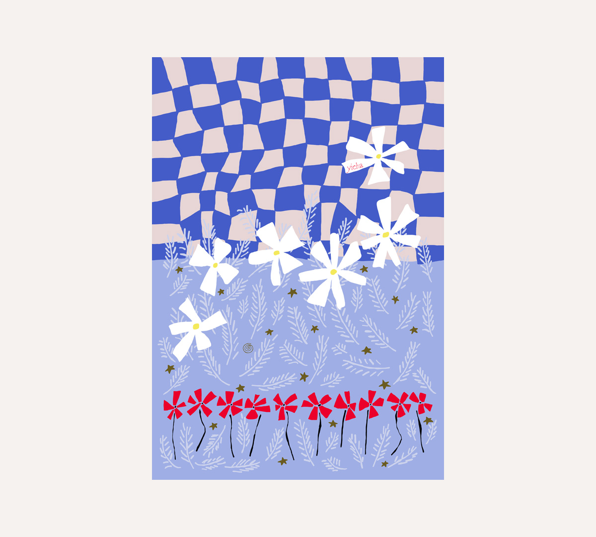 Near the sea, where rocks cast long shadows, an oasis of poppies and daisies sways in the breeze. The sunlight reflects the sea’s shimmer onto their soft petals.
